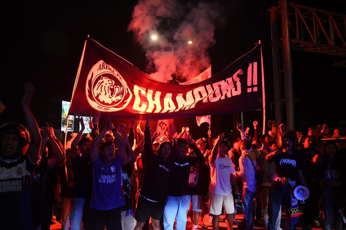 Aremania melakukan penyambutan dengan menyalakan flare dan sejumlah banner bertuliskan Champions. Mereka melakukan penyambutan sekaligus mengawal tim Arema FC menuju mess di Jl Langsep, Kota Malang.