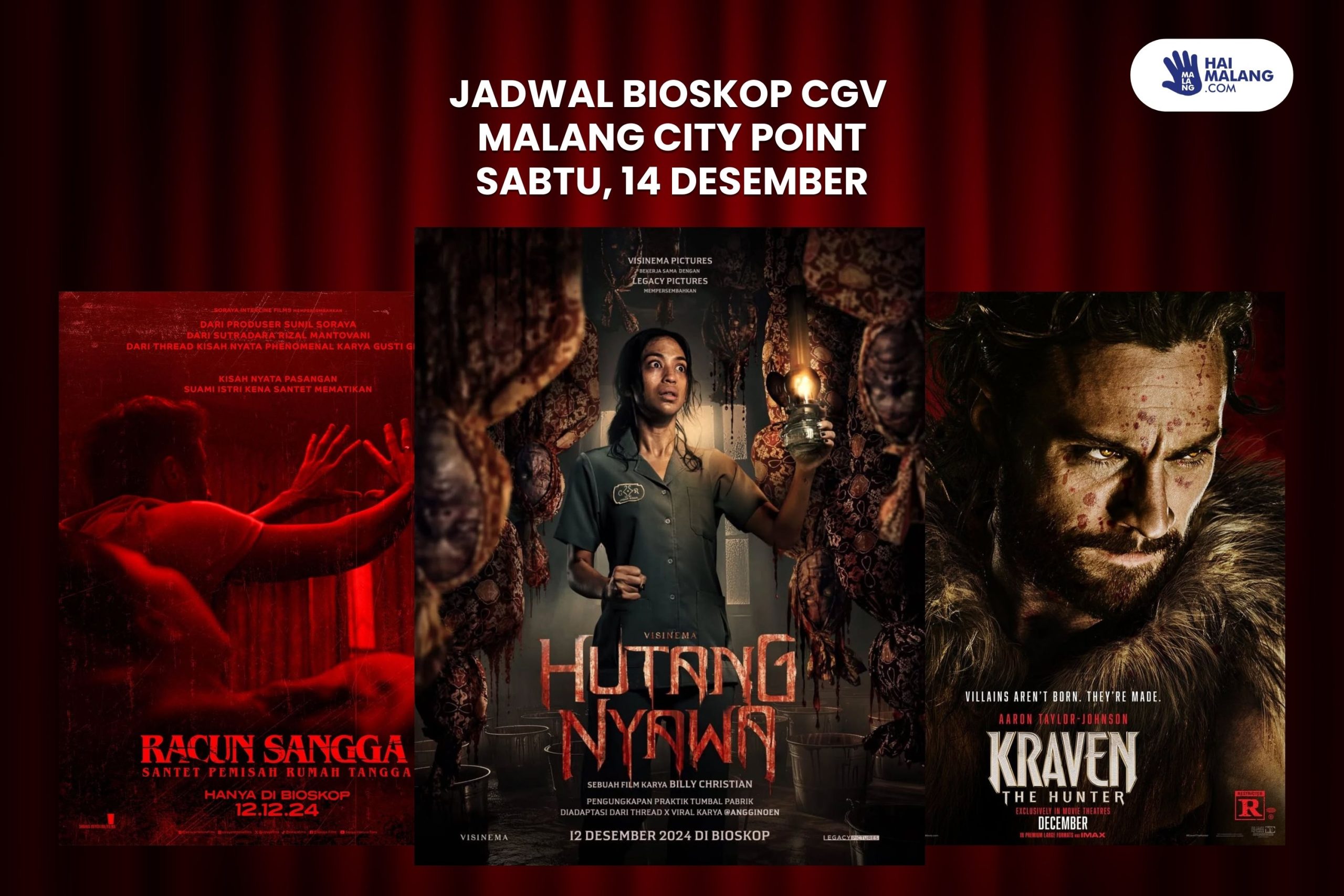 HaiMalang.com – Berikut ini jadwal film CGV Malang City Point yang akan tayang Sabtu, 14 Desember 2024. Beberapa film yang dapat Kamu tonton yakni Kraven the Hunter, Wicked, dan Moana 2. Selain itu juga ada film horror Indonesia terbaru yakni Racun Serangga dan Hutang Nyawa.