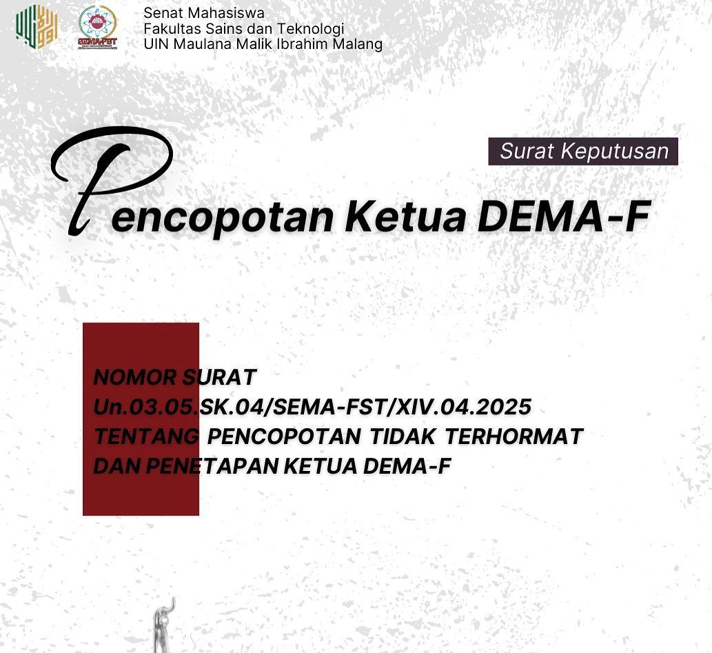 “Mencopot Saudara Ilham Prada Firmansyah dari jabatannya Ketua Dewan Eksekutif Mahasiswa Fakultas Sains dan Teknologi Universitas Islam Negeri Maulana Malik Ibrahim Malang periode 2025.”