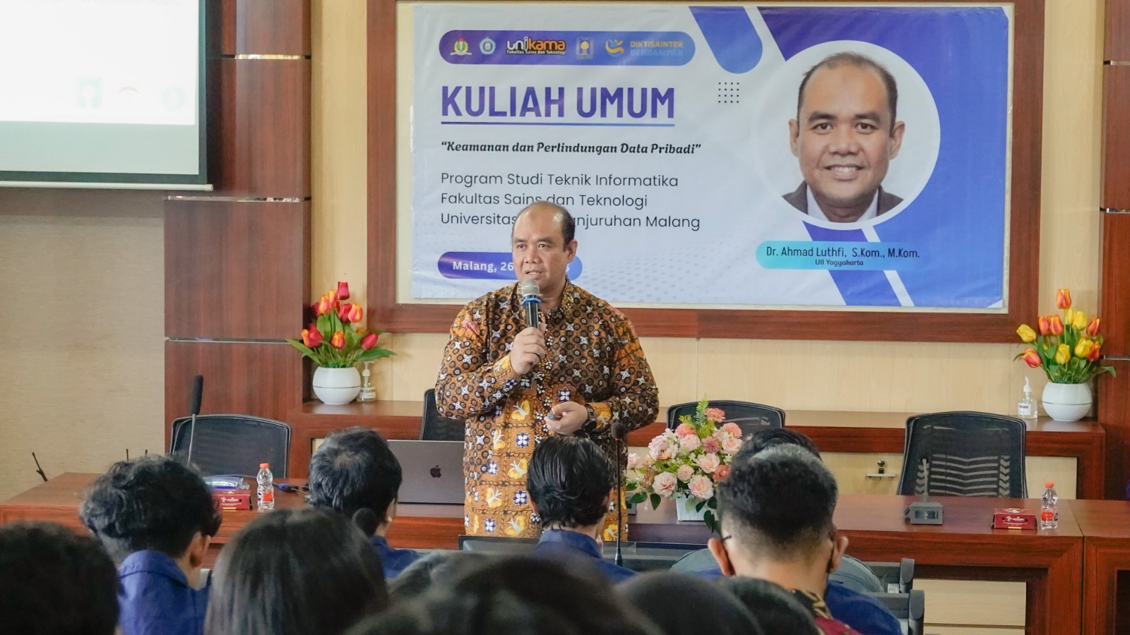 HaiMalang.com – Untuk meningkatkan kesadaran mahasiswa mengenai hukum data pribadi, Program Studi Teknologi Informatika (TI) dari Fakultas Sains dan Teknologi (FST) Universitas PGRI Kanjuruhan Malang (Unikama) mengadakan kuliah umum bertema “Keamanan dan Perlindungan Data Pribadi” pada Senin, (26/5/2025).