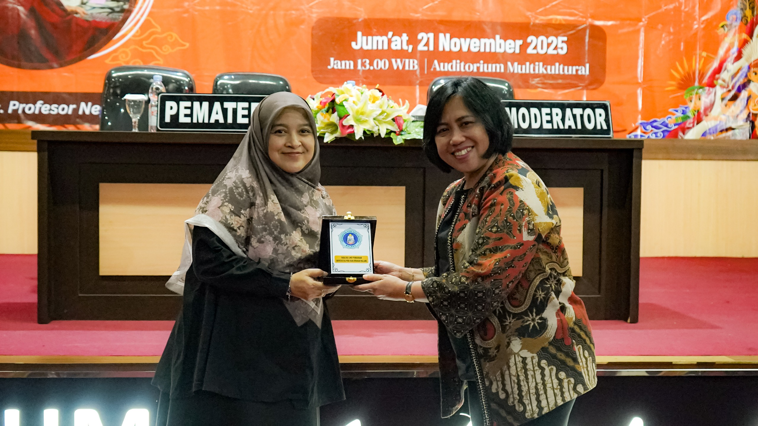 (kanan) Dekan FIP Unikama, Dr. Cicilia Ika Rahayu Nita, M.Pd. memberi cendera mata kepada Asc. Profesor Neni Mariana, Ph.D., (kiri) dari Universitas Negeri Surabaya (UNESA).